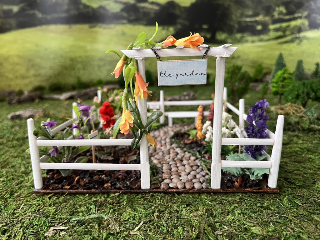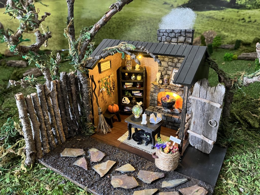When making miniatures, I don’t measure exactly because that would add math and subtract fun. I mostly eyeball pieces to see how well they fit. Close enough works for me. I collect all sorts of things for my builds–scraps of styrofoam, plastic packaging, wine corks, Q-tips, coffee stirrers, etc. I like using nature in my work, so I’m often foraging in the backyard for interesting twigs, seed pods, tree bark, anything I can repurpose. For example, I made the black cauldron in “The Cottage” from a painted acorn cap with handles made from jewelry parts. I’m constantly collecting random “bits and bobs” to use later. Fortunately, hoarding miniature parts doesn’t take up too much space.